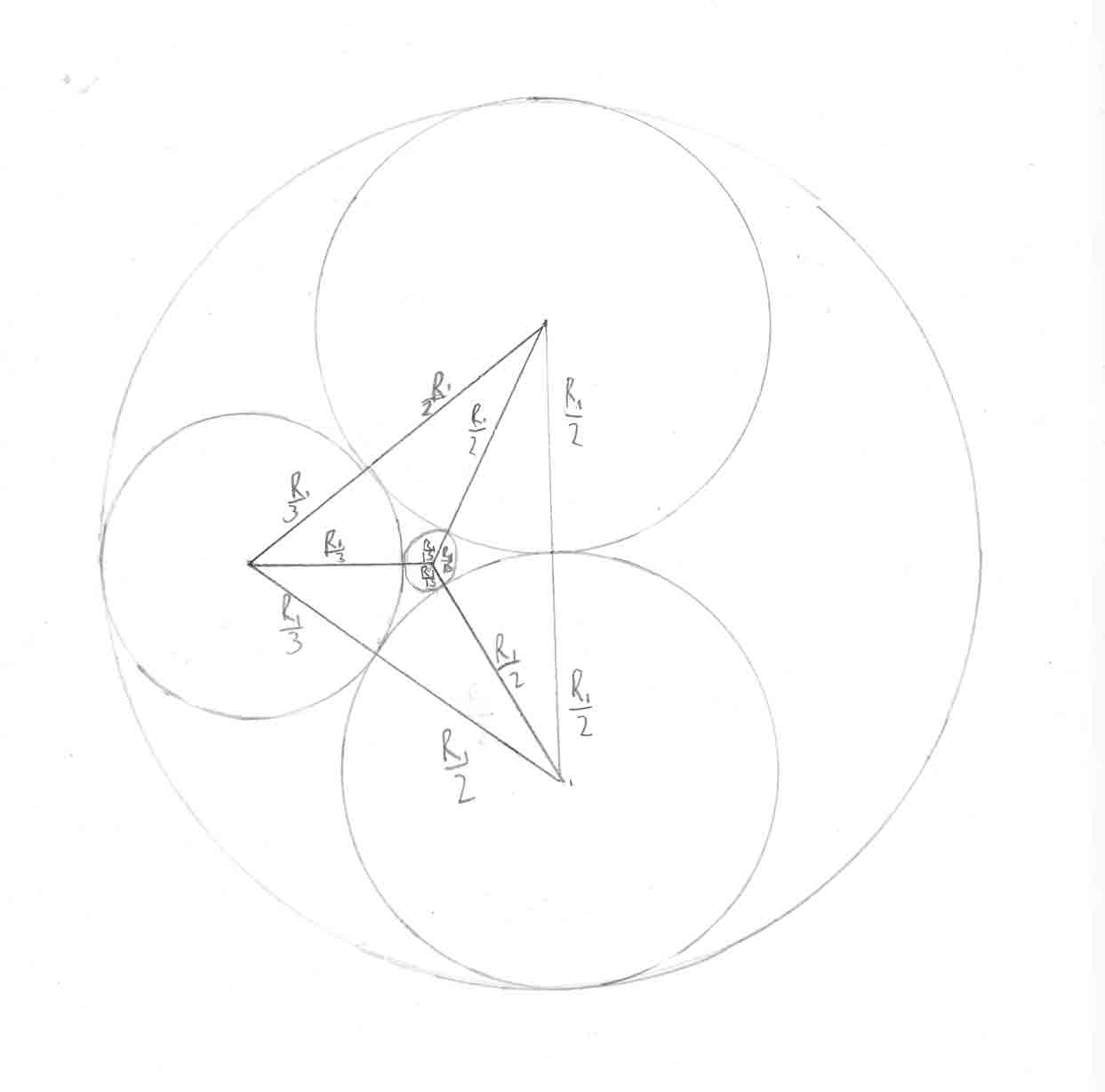 February 2015 - Circles Inside Circles (Solution)The answer is 225. Let the largest circle have radius R1. The next largest circles have radius R1/2. The second smallest circle's radius must be found using Pythagoras' theorem. Make a triangle with the centres of these circles: The largest circle, one of the next largest circles, and the second smallest circle. Let the second smallest circle have radius R2. The horizontal side length is R1- R2. The vertical side length is R1/2. The hypotenuse has length R1/2+R2. Thus (R1- R2)2+R12/4=(R1/2+R2)2. Expanding, R12- 2R1R2+ R22+ R12/4=R12/4+ R1R2+ R22. Subtracting R12/4 - 2R1R2+ R22, we have R12=3R1R2. Thus R1=3R2 and R2=R1/3. Consider another right-angled triangle with the centres of these circles: The largest circle, one of the second largest circles, and the smallest circle. Let the smallest circle have radius R3. The vertical side is the same. The horizontal side has length R1-2R2- R3. The hypotenuse has length R1/2+R3. Solving in a similar manner to the previous step, R3=R1/15. Now, the smallest circle has area πR12/225=1. Thus πR12=225. However, the largest circle has area πR12. Thus the largest circle has area 225. ![]()
